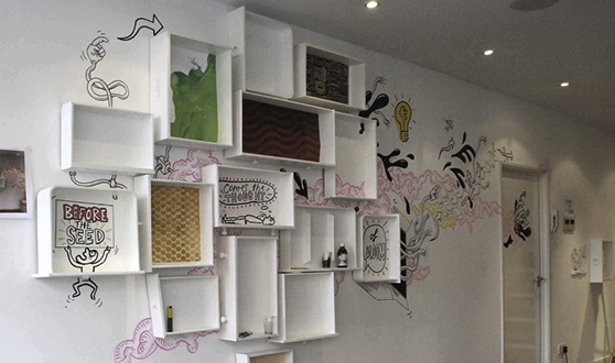 But while I wait for this scientific breakthrough to materialise, I can at least quench my curiosity by visiting my friend and illustrator/animator/sometime rugby player Simon Spilsbury, hard at work on a mural he’s been commissioned to paint, across the entire reception wall of London marketing agency Meteorite. He is currently about a third of the way through – an epic creation full of characters, words, energy flowing from left to right….